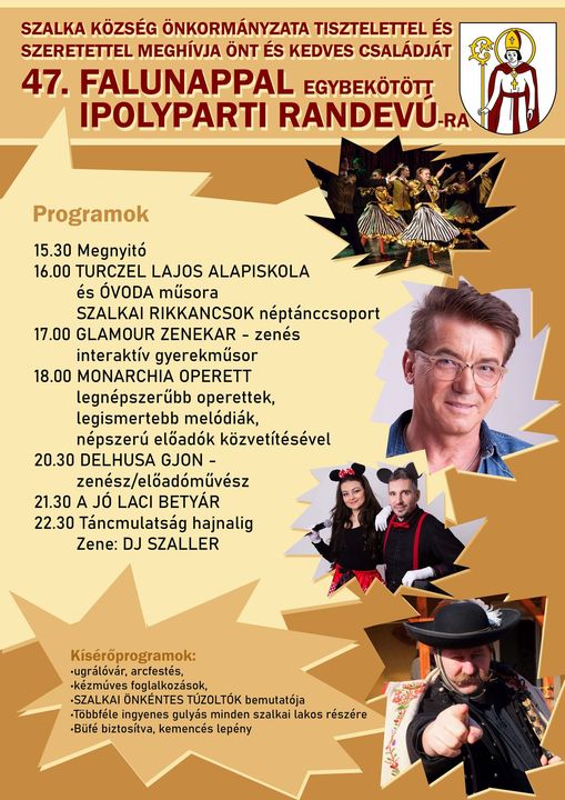 Szalka Község Önkormányzata tisztelettel meghívja Önt és kedves családját a 47. Falunappal egybekötött Ipolyparti Randevúra. Kísérőprogramok: •ugrálóvár, arcfestés, •kézmúves foglalkozások, •SZALKAI ÖNKÉNTES TÚZOLTŐK bemutatója •Többféle ingyenes gulyás minden szalkai lakos részére •Büfé